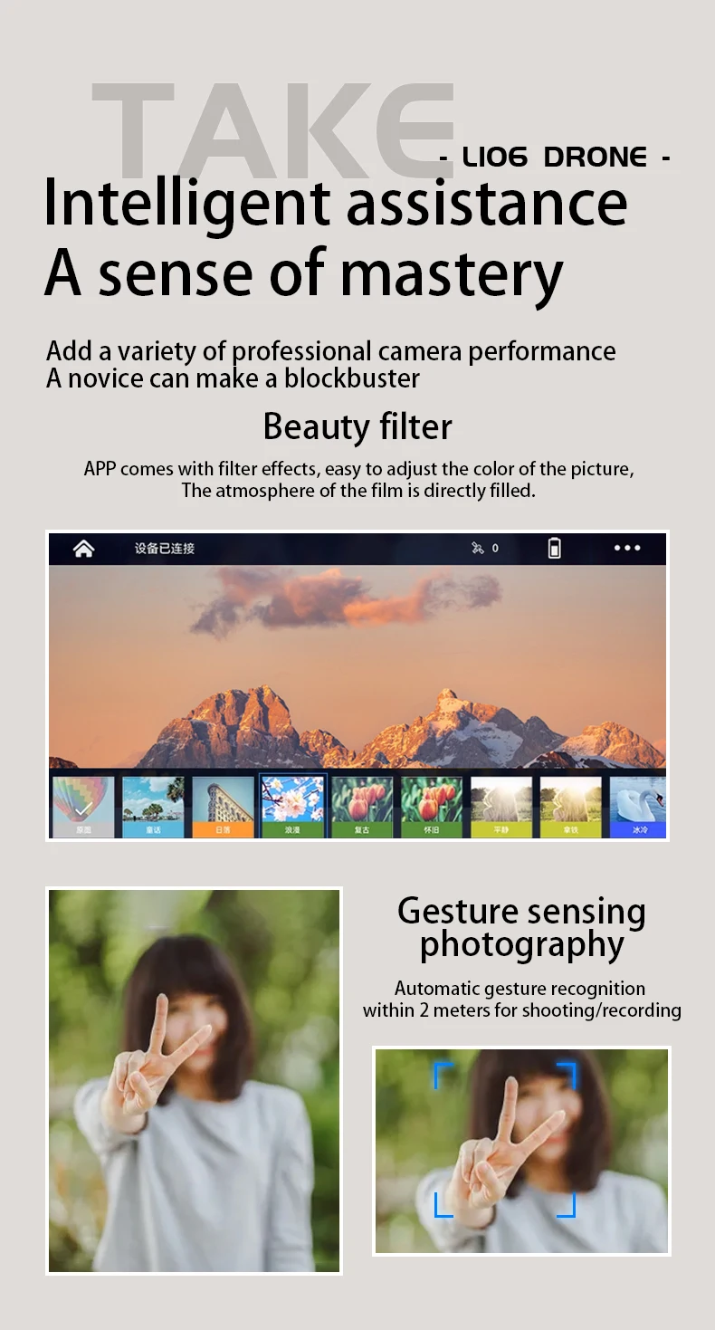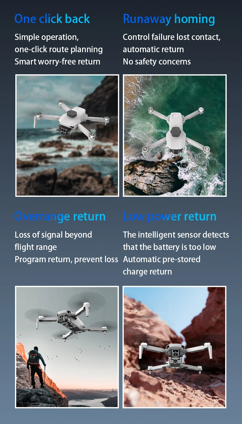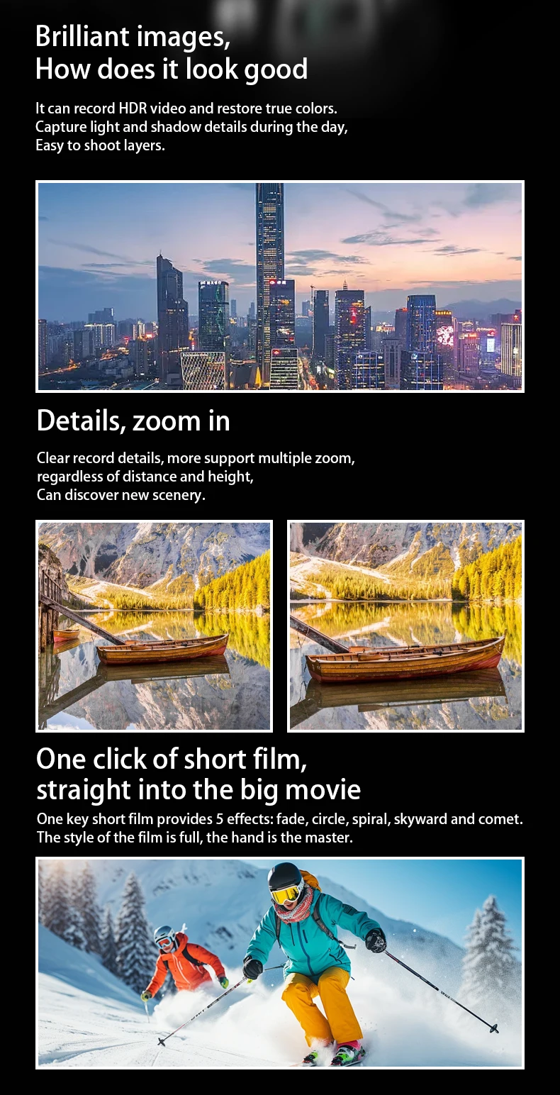 Eis electronic anti shake, Electric adjustment dual camera, intelligent perception obstacle avoidance, GPS intelligent return, intelligent follow, surround shooting, 5G digital image transmission, waypoint flight