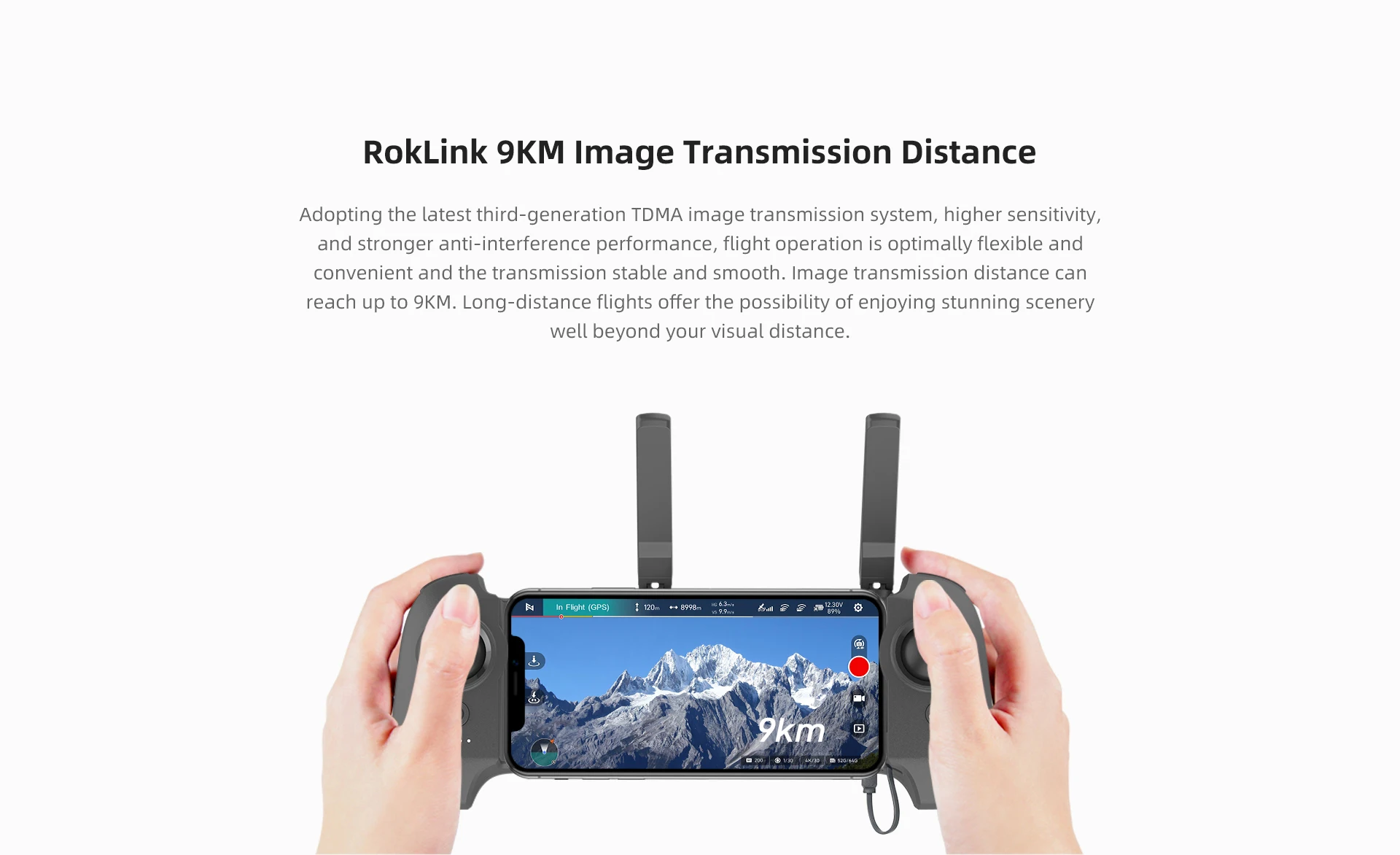 Fly further and longer than ever before. With an impressive 9km image transmission distance, you can explore vast areas and capture images from incredible new perspectives. The powerful battery provides a maximum flight time of 31-37 minutes, giving you ample time to get the perfect shot.