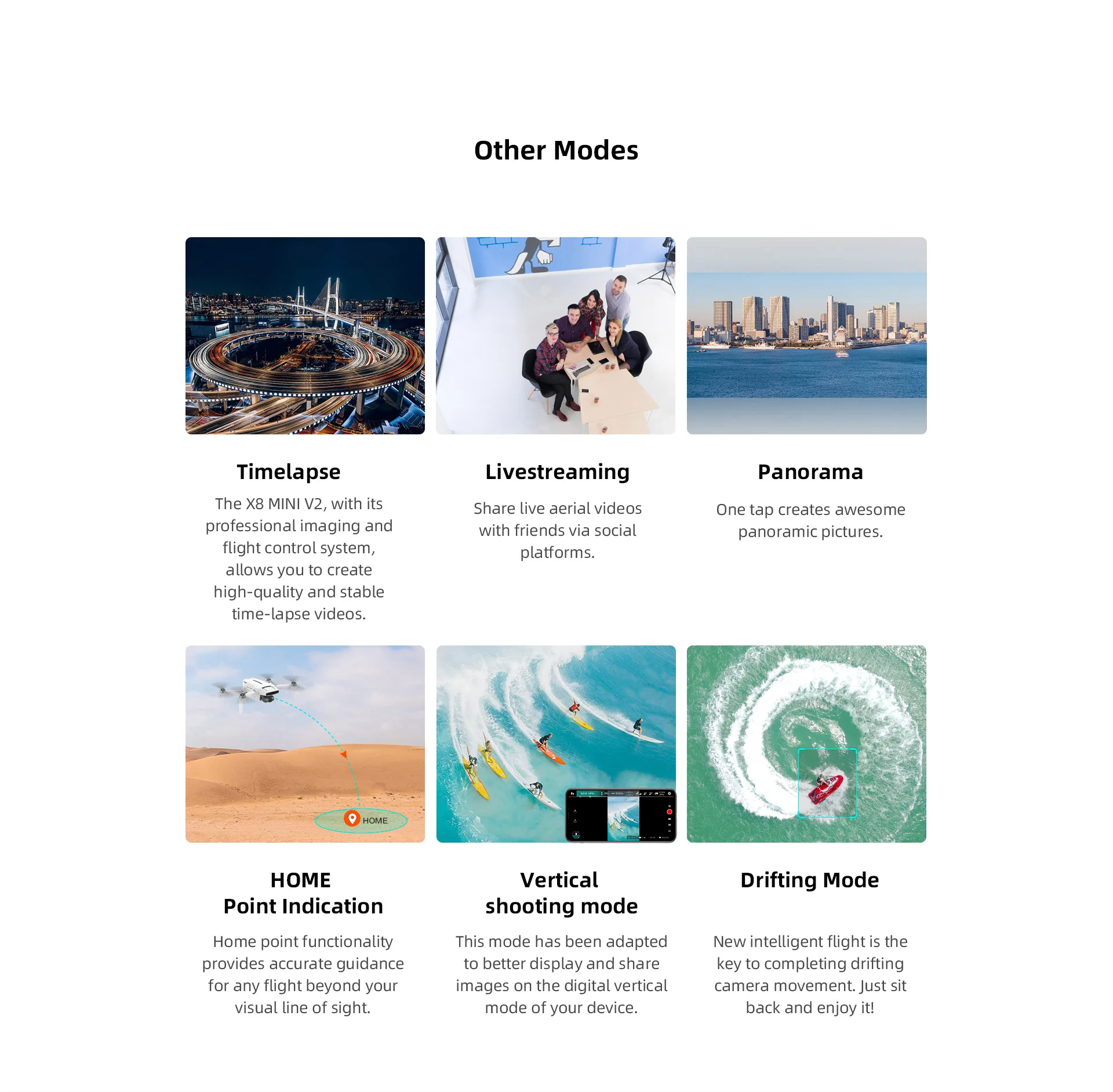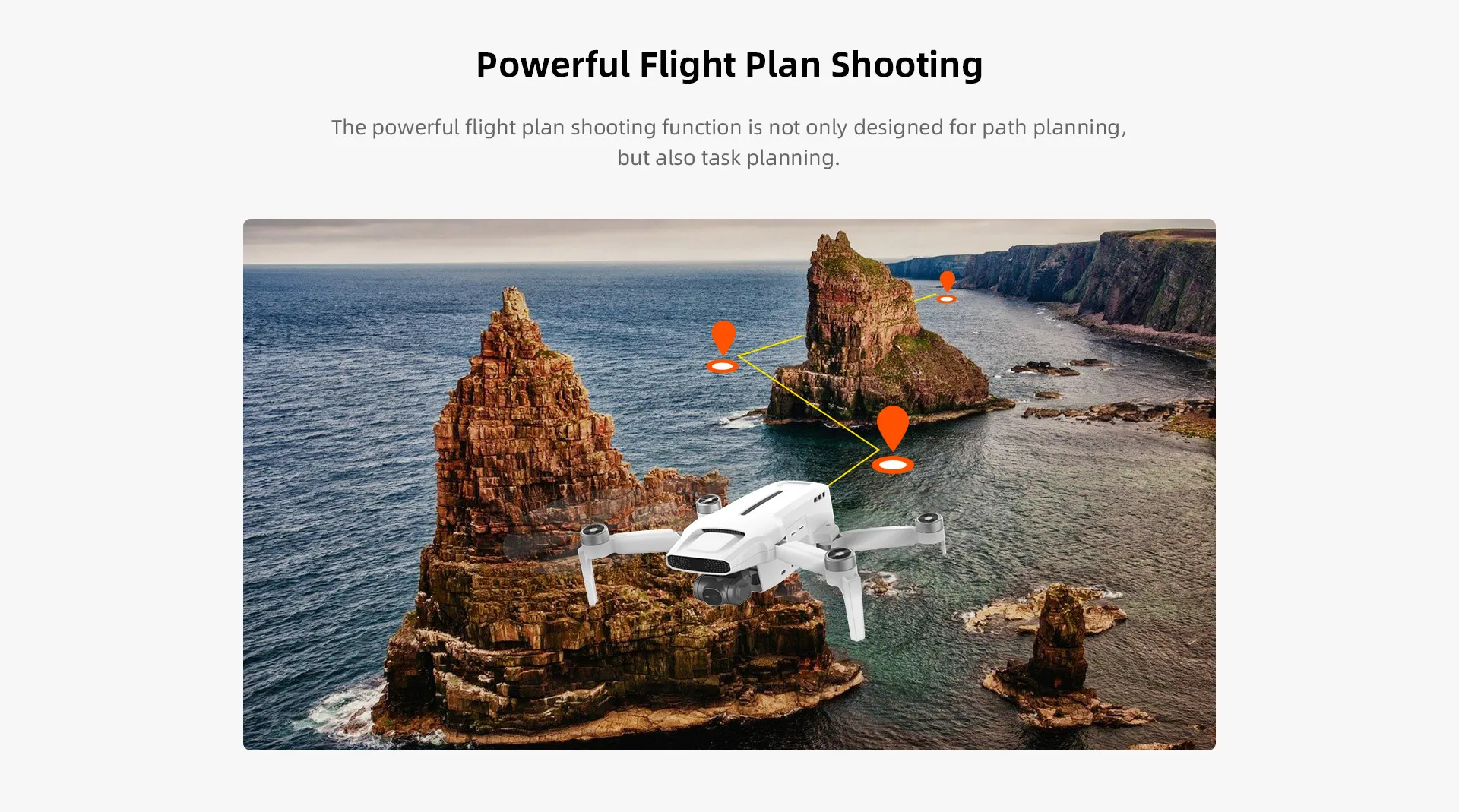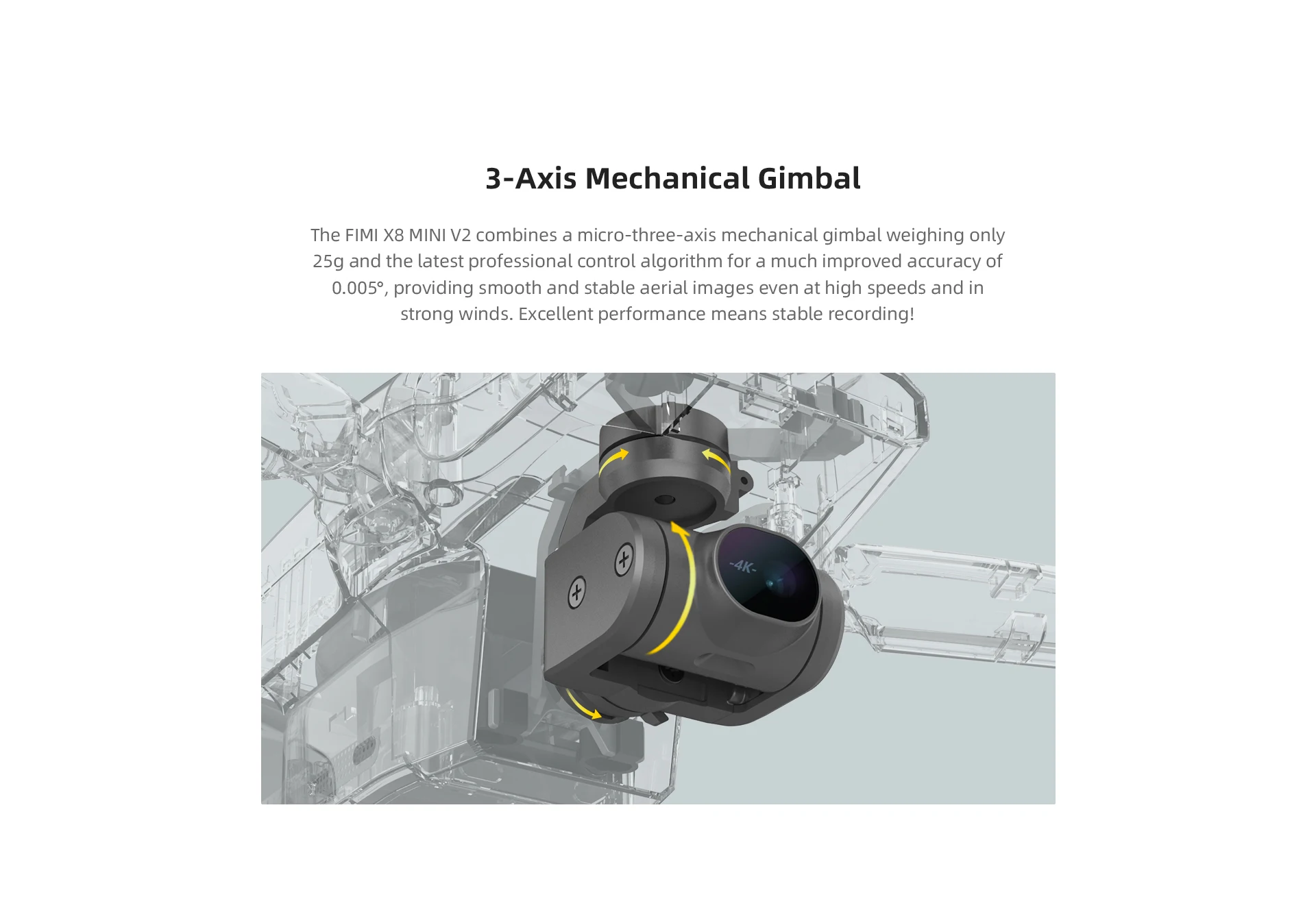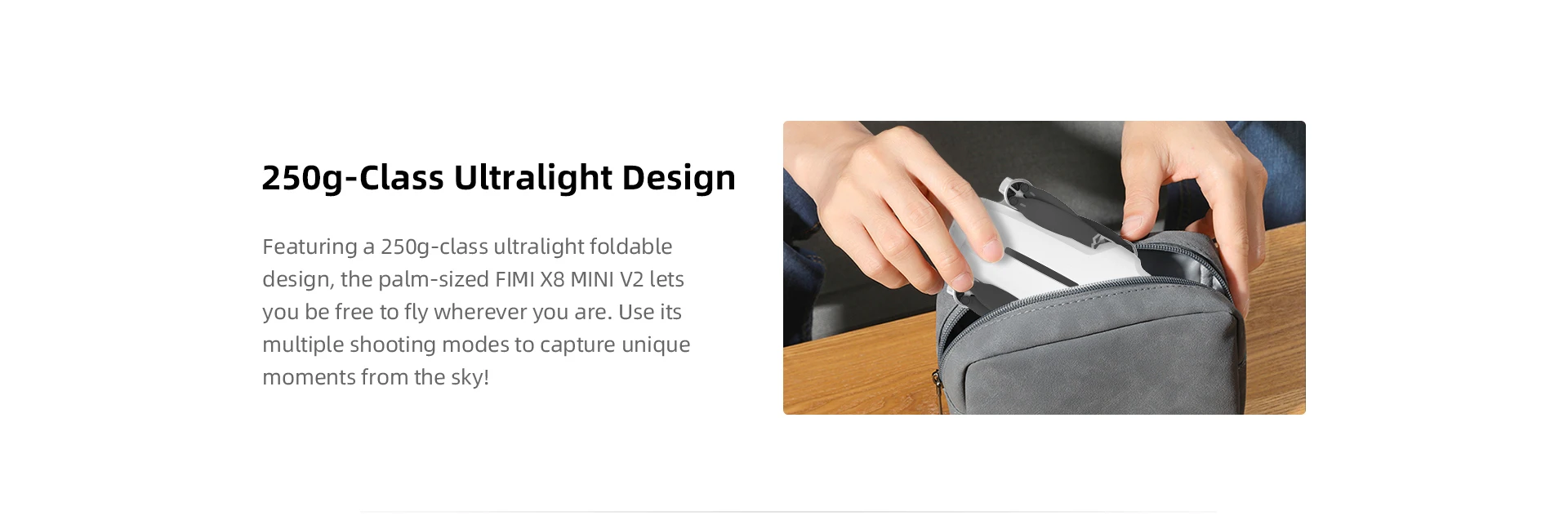 Adopting the latest third-generation TDMA image transmission system, higher sensitivity, and stronger anti-interference performance, flight operation is optimally flexible and convenient and the transmission stable and smooth. 2. 250g-Class Ultralight Design: Featuring a 250g-class ultralight foldable design, the palm-sized FIMI X8 Mini V2 lets you be free to fly wherever you are. 3. Type C Fast-Charging Battery: The Type C charging port on the battery allows or 9V/3A rapid charging. 4. Smart Tracking Modes: New SOC technology and built-in 2T AI computing power can identify and stably track up to 30 kinds of targets, such as human beings, cars, boats, and animals. 5. 4k Camera with Three-Axis Mechanical Gimbal: The FIMI X8 Mini V2 combines a micro-three-axis mechanical gimbal weighing only 28g and the latest professional control algorithm for a much improved accuracy of 0.005°, providing smooth and stable aerial images even at high speeds and in strong winds. Function: 9KM Distance, 3-axis Gimbal, 250g-Class Ultralight Design, Smart Tracking Modes, One-Tap Video, Night Shooting, Powerful Flight Plan Shooting. |