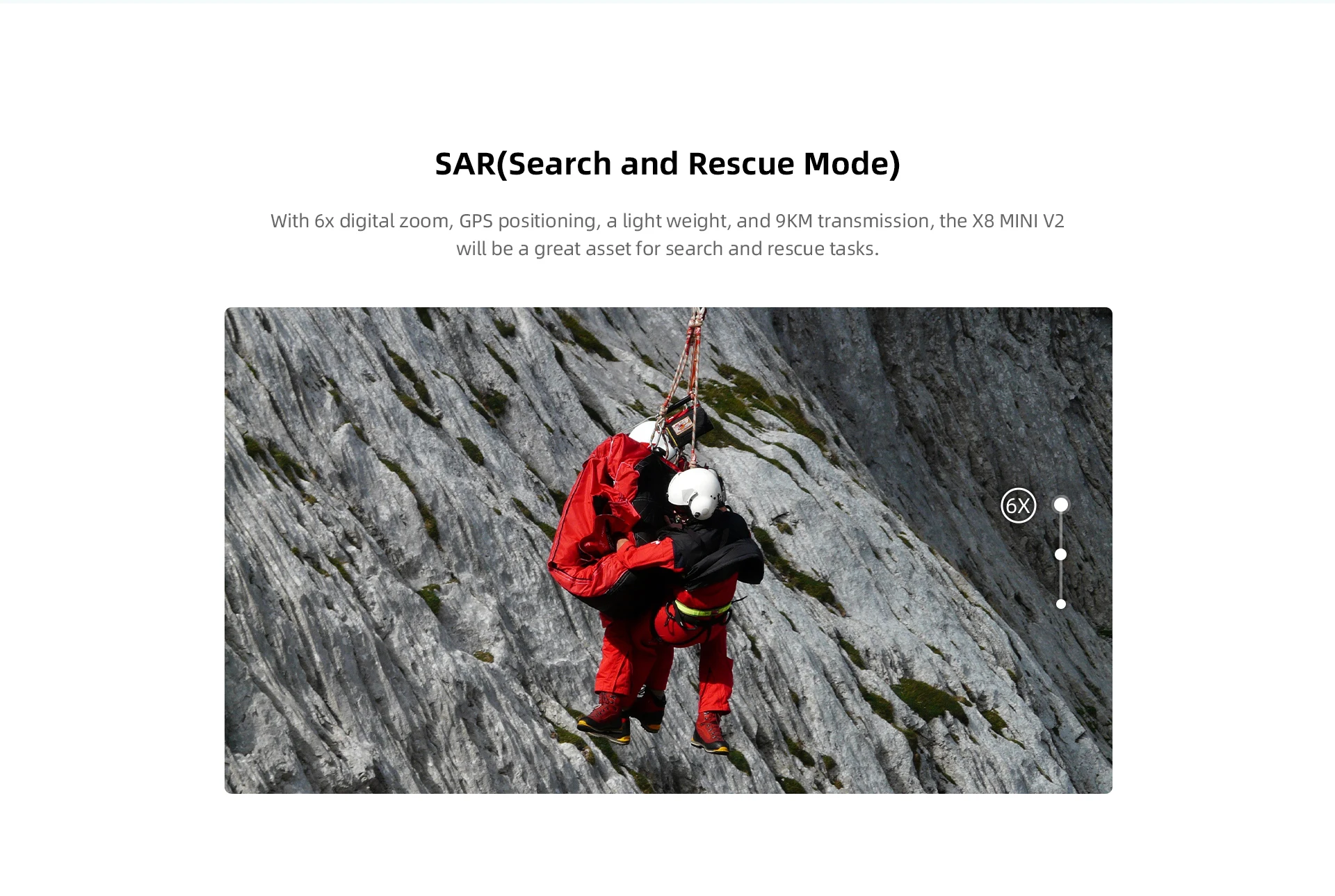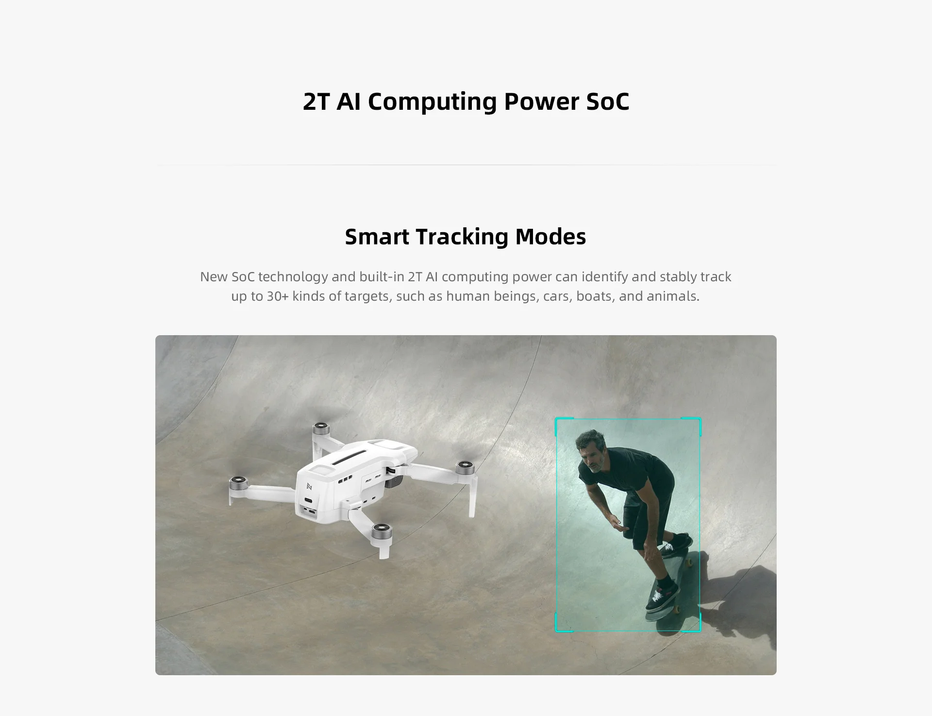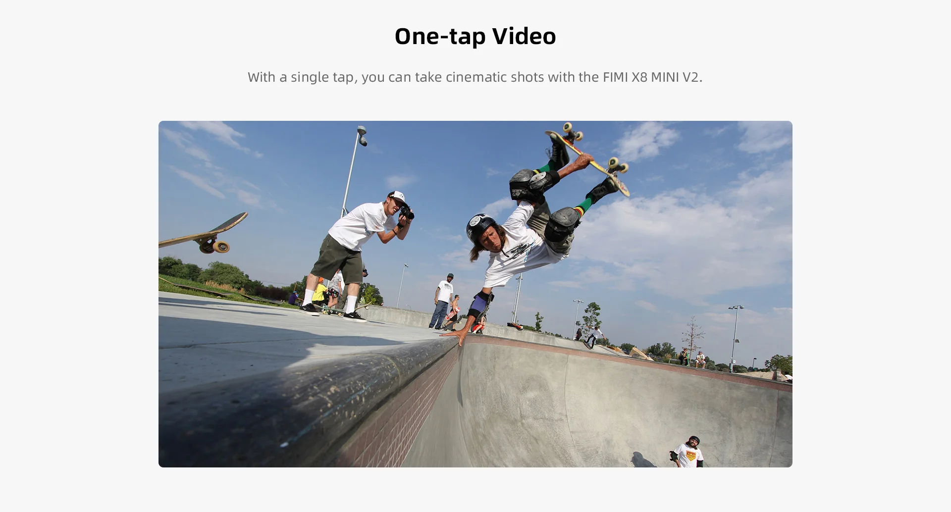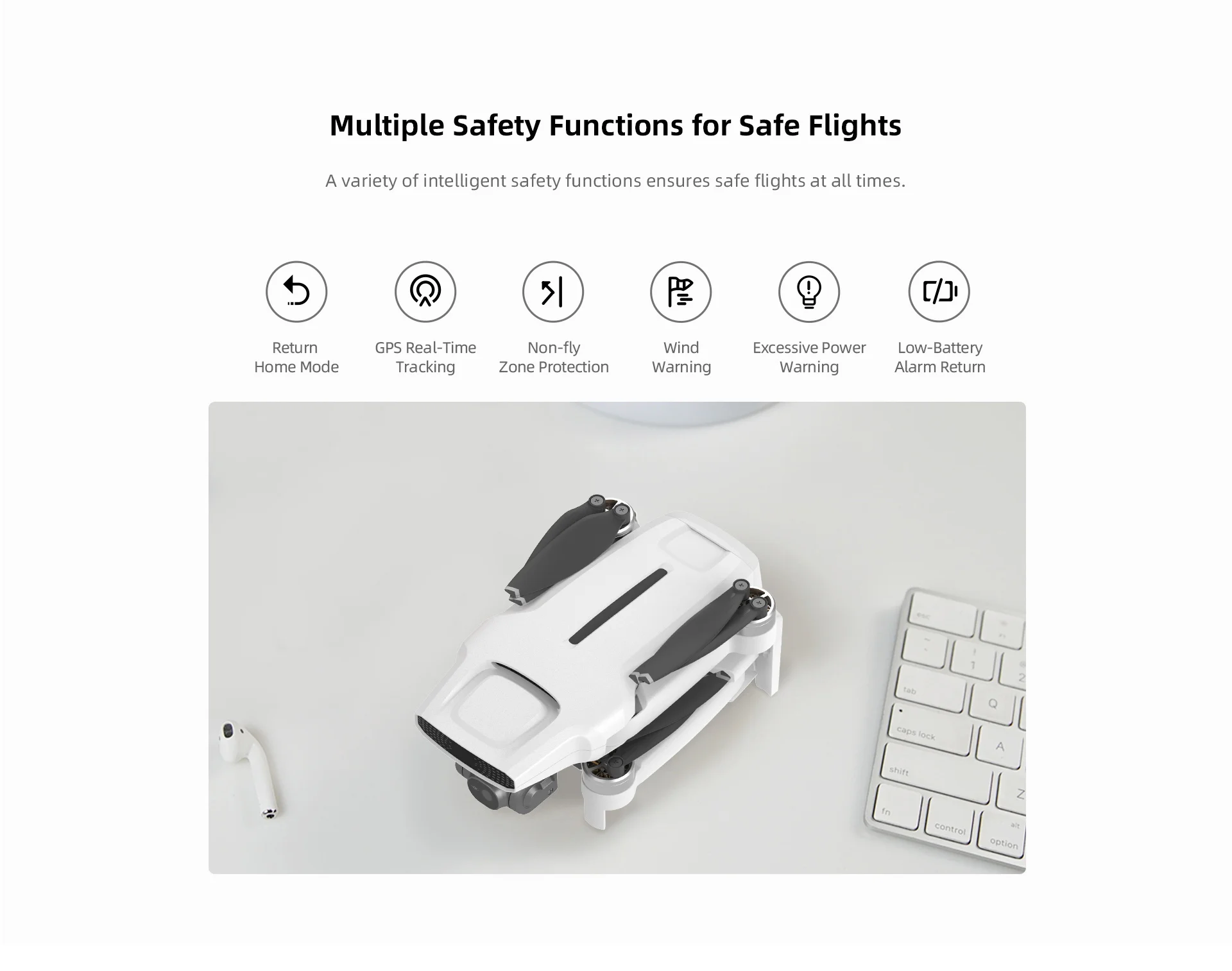 Adopting the latest third-generation TDMA image transmission system, higher sensitivity, and stronger anti-interference performance, flight operation is optimally flexible and convenient and the transmission stable and smooth. 2. 250g-Class Ultralight Design: Featuring a 250g-class ultralight foldable design, the palm-sized FIMI X8 Mini V2 lets you be free to fly wherever you are. 3. Type C Fast-Charging Battery: The Type C charging port on the battery allows or 9V/3A rapid charging. 4. Smart Tracking Modes: New SOC technology and built-in 2T AI computing power can identify and stably track up to 30 kinds of targets, such as human beings, cars, boats, and animals. 5. 4k Camera with Three-Axis Mechanical Gimbal: The FIMI X8 Mini V2 combines a micro-three-axis mechanical gimbal weighing only 28g and the latest professional control algorithm for a much improved accuracy of 0.005°, providing smooth and stable aerial images even at high speeds and in strong winds. Function: 9KM Distance, 3-axis Gimbal, 250g-Class Ultralight Design, Smart Tracking Modes, One-Tap Video, Night Shooting, Powerful Flight Plan Shooting. |