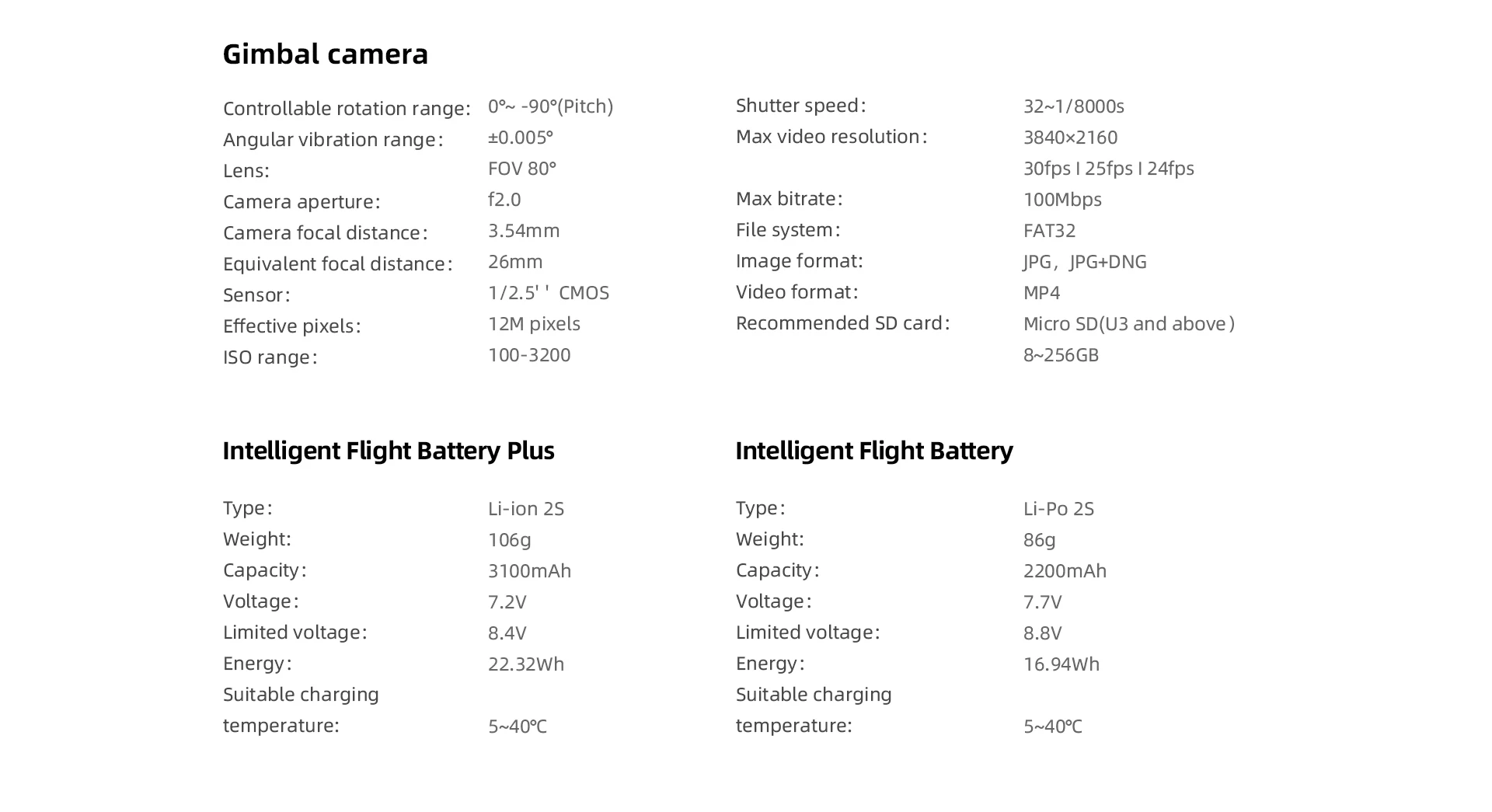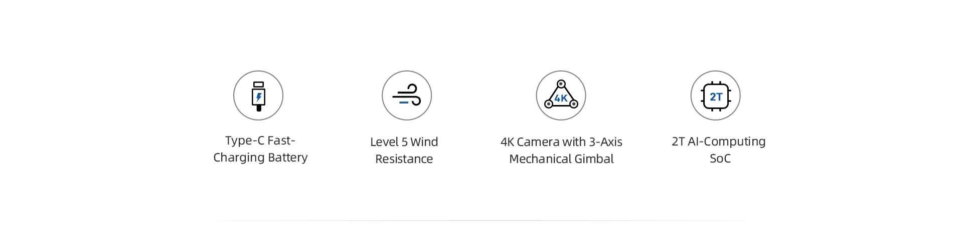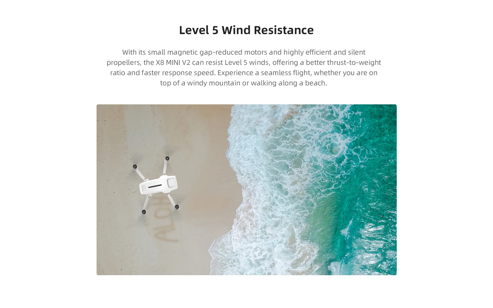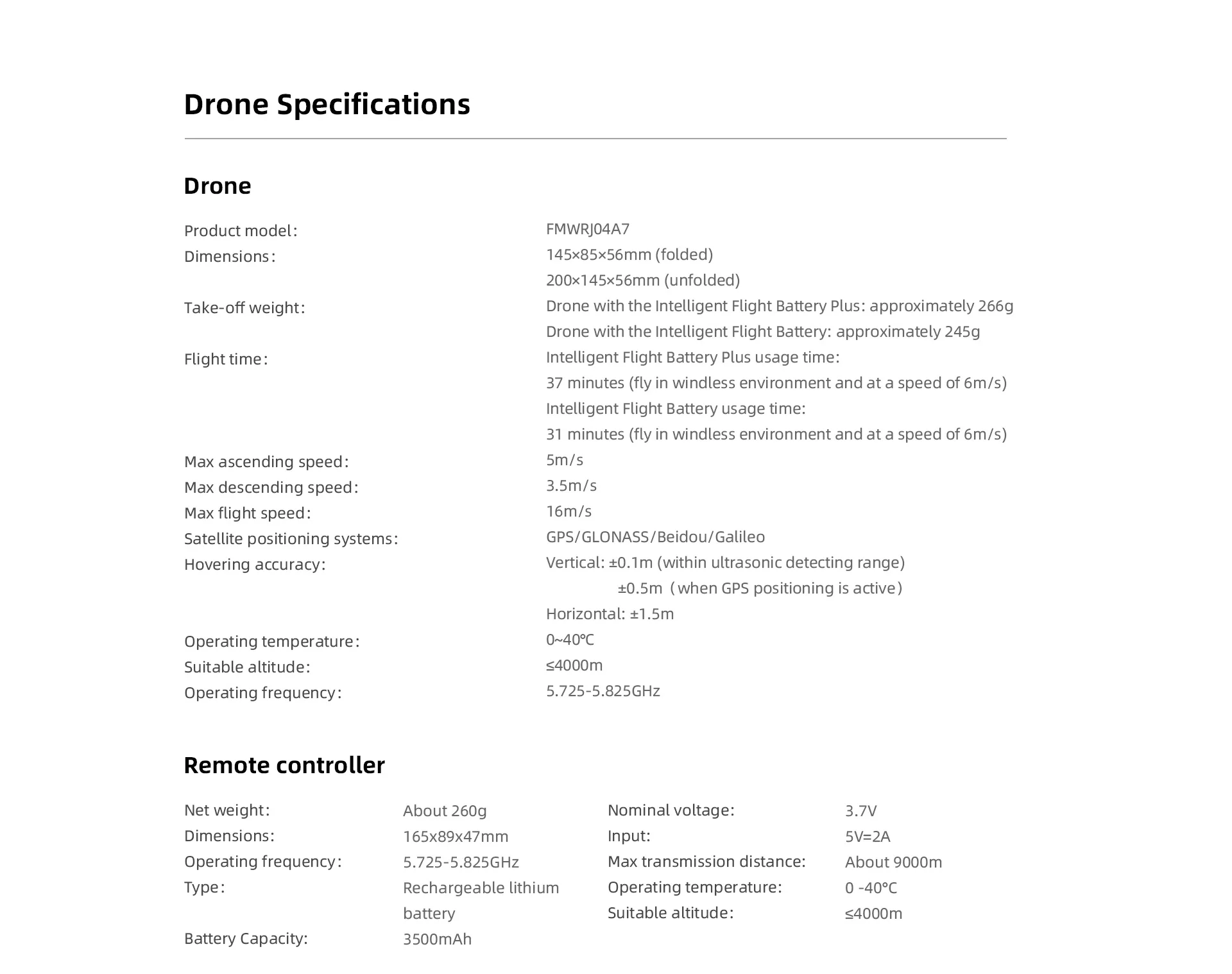 Adopting the latest third-generation TDMA image transmission system, higher sensitivity, and stronger anti-interference performance, flight operation is optimally flexible and convenient and the transmission stable and smooth. 2. 250g-Class Ultralight Design: Featuring a 250g-class ultralight foldable design, the palm-sized FIMI X8 Mini V2 lets you be free to fly wherever you are. 3. Type C Fast-Charging Battery: The Type C charging port on the battery allows or 9V/3A rapid charging. 4. Smart Tracking Modes: New SOC technology and built-in 2T AI computing power can identify and stably track up to 30 kinds of targets, such as human beings, cars, boats, and animals. 5. 4k Camera with Three-Axis Mechanical Gimbal: The FIMI X8 Mini V2 combines a micro-three-axis mechanical gimbal weighing only 28g and the latest professional control algorithm for a much improved accuracy of 0.005°, providing smooth and stable aerial images even at high speeds and in strong winds. Function: 9KM Distance, 3-axis Gimbal, 250g-Class Ultralight Design, Smart Tracking Modes, One-Tap Video, Night Shooting, Powerful Flight Plan Shooting. |